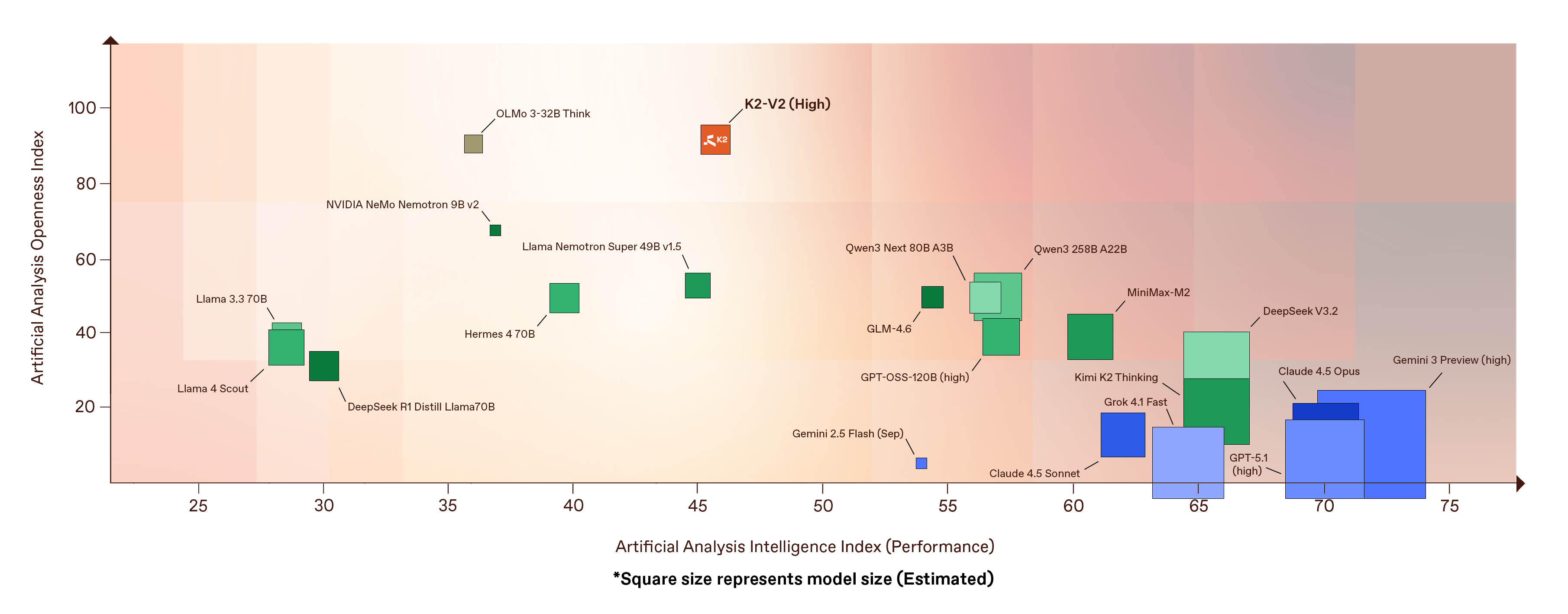 According to data in the latest leaderboard published by artificialanalysis.ai, plotted across performance, openness, and model scale, the LLM landscape becomes unmistakably clear. Closed frontier U.S. models cluster on the far right, while Chinese open-weight systems fill the middle with partial transparency and heavy footprints. K2 stands alone: fully open, reproducible, and performant, offering a true open-source alternative in a space where no other viable option exists.